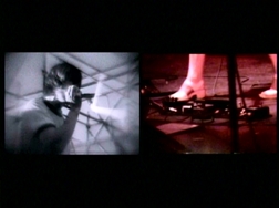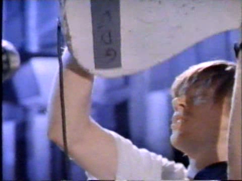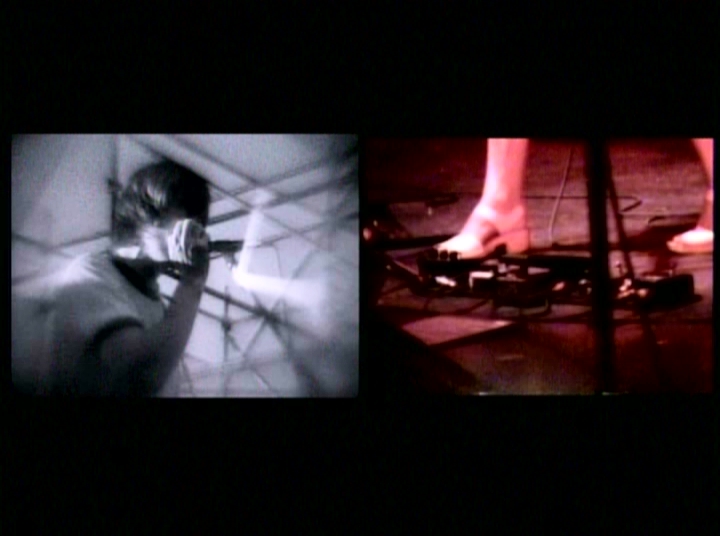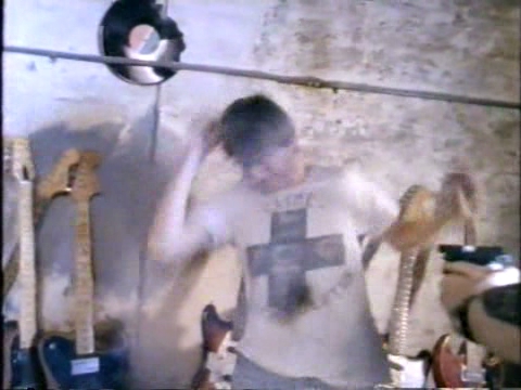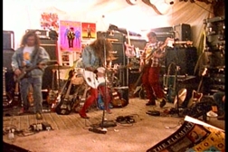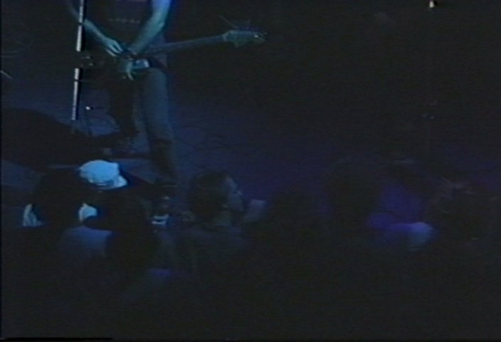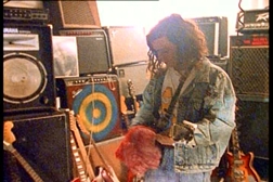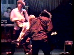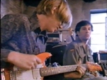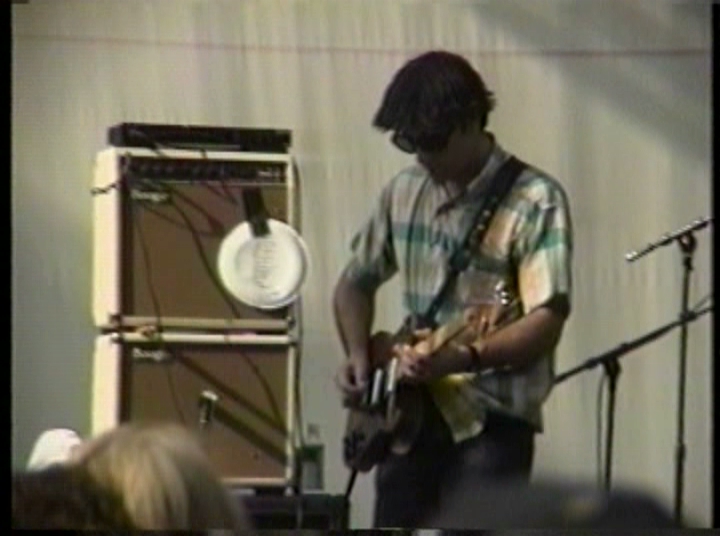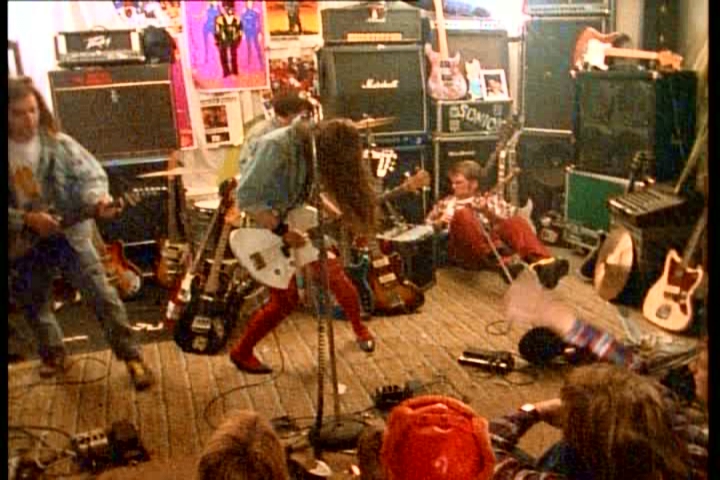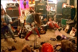 Wait, two sunburst Mustangs? Yup, clear as day, one on either side of Steve getting shot. One is clearly Lee's with the humbucker in the middle, and one looks almost identical only without the humbucker -- this is the one I had a picture of Thurston using and wondered if it might be Lee's. Turns out there's two, and Thurston appeared to be using a sunburst Mustang on at least the North American 'Daydream Nation' tour, as evidenced by a picture from one of the shows at the Roxy on this tour (same show used for the 'Trees Outside the Academy' cover). He's also using it in a picture in the 'Goodbye 20th Century' book where it's labelled as 07/26/86 CBGB, which just CAN'T be correct -- it's clearly from the Daydream era, with Lee playing the 12-string Strat and Kim playing her Rickenbacker, plus Thurston is wearing one of the shirts he wears on the very Southbank Show I'm describing!