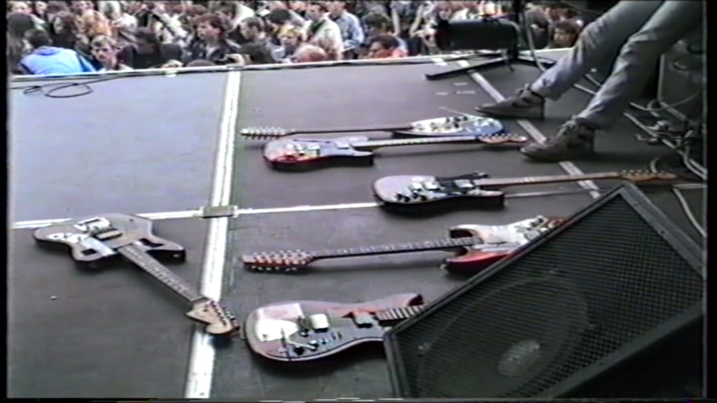 Let's pause for a second and go back to those "guitar room" pictures. We've covered most of them already, aside from the Hofner-style bass (which I have no information on) and that bizarre wood..thing..Steve is holding (seriously, does anyone know what this is? it's certainly distinct..). The Univox Plexiglas is just barely visible, and I think Thurston is playing it in this picture from 11/05/86, in what appears to be standard tuning, so perhaps he was using it for their cover of "The Red and the Black" with fIREHOSE? That's my best conjecture. As far as I can tell, after the Marauder was stolen, the Univox replaced it for the EG#EG#EG# tuning, on both "Expressway" and "PCH" in 1987. I only have video documentation of it beginning in September of '87, though, so it's possible he used something else before then.