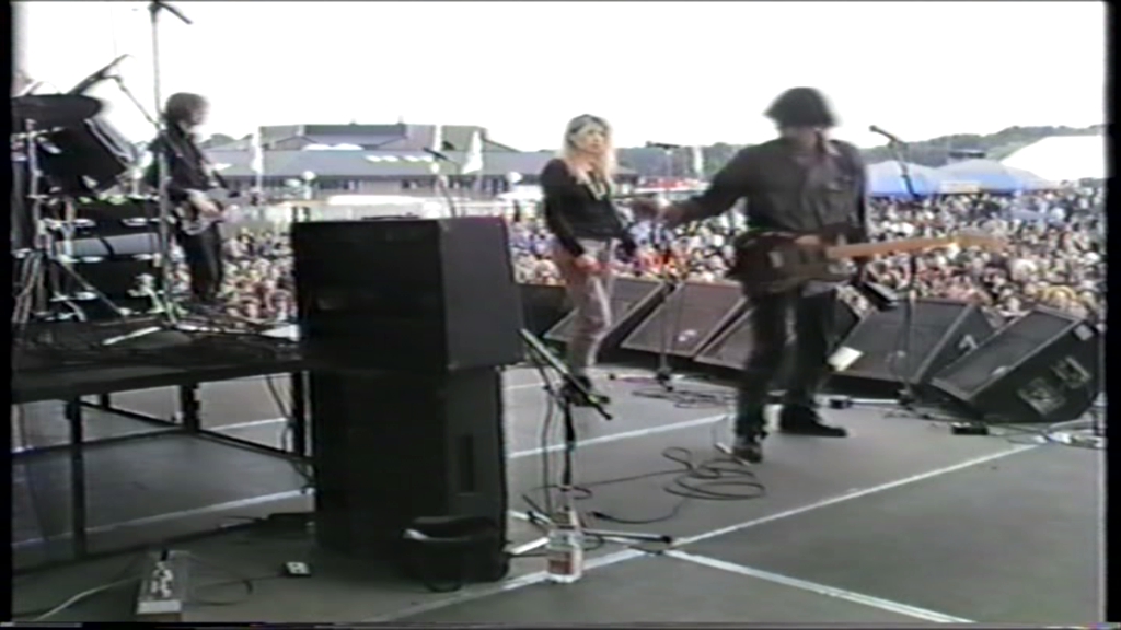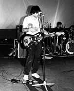 I've never seen any video footage of an SY gig from 1988, so this year has always been a real grey area for me. A few pictures exist from the aforementioned November '88 Roxy gigs, where Thurston can be seen using his red Jazzmaster, which would have been newly acquired, as well as the sunburst Mustang, the Drifter, and the blue Jazzmaster, which now has two soapbar pickups and looks like a 'normal' Jazzmaster. Kim is using her Gibson Thunderbird bass. None of the shots of Lee are clear enough to determine what he's playing. I'm not entirely sure, but it looks like Thurston might be playing the sunburst Mustang in the picture where his hair is all wild, and since Lee's singing that would pretty much guarantee they're playing "Hey Joni", making the Mustang in GABDEG.