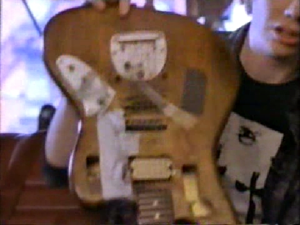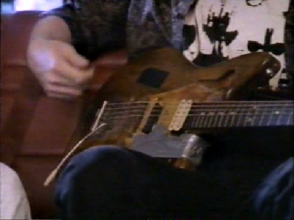 Initially, Thurston is seen holding the familiar 'old wood' Jaguar while the band is interviewed on a couch. It looks pretty much as it's expected to look beyond '87. Other guitars are strewn around in the background. Curiously, these same guitars are later seen in a cluster around the drum kit while they're being interviewed (in separate clothes, presumably from another day). On what appears to be another day, or after another costume change at least, they're interviewed by John Cale with more of the same guitars reconfigured in the background. In fact, I'm not sure how many times they were interviewed but the same guitars seem to keep reappearing! So let's look at em...