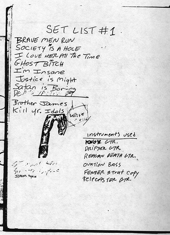 Lee pops up with a mysterious 12-string in a picture from a March 23rd, 1983 show that may have just been Lee, Kim, and Thurston as a trio, possibly doing an extended feedback set. Where the 12-string came from, I do not know! In June, the band made their first trip to Europe, where they seem to have acquired the aforementioned "REAGAN DEATH" guitar, a white SG style made by Gherson. Its most notable feature was its crazy whammy bar, which would inspire "Kill Yr Idols". While Thurston started using this guitar in the newly unleashed GGDDD#D# tuning, Kim also took a liking to it and would often play it instead of the Knox. By the way, after twenty years I've finally realized that the brand is Gherson, not Gershon! Oops...you can see the exact model Thurston used here.