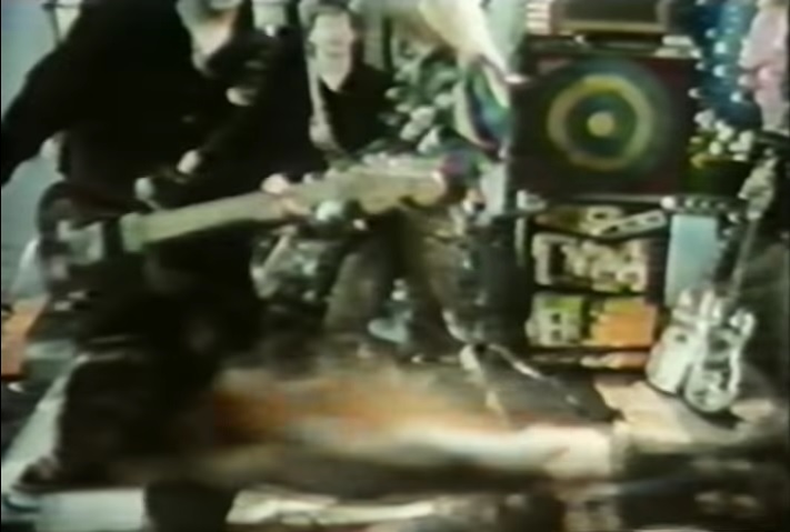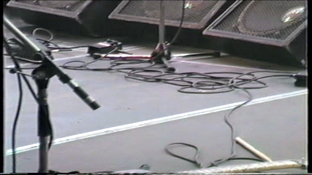 Not only do we have a better view of two instruments that were previously unidentified, it turns out that the fucking Teisco was there the entire time! And it's also covered in, uhhh...duct tape? Aluminum foil? I mean, check this pic out, you can see the sunburst finish underneath on the top wing and upper butt(?). So that leads me to believe this may very well be the same sunburst Teisco "Hagstrom" style that has always been on this site, used by Thurston at the 10/10/85 Bremen show (and presumably the rest of the tour, just elusive in photos). There too, it was in F#F#F#F#EB. I could be wrong, but it really seems like they covered this guitar in duct tape for some reason and continued using it sporadically during '86. Any other theories? (Also, I do believe it to be the guitar seen in the "Teenage Riot" video.)
