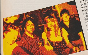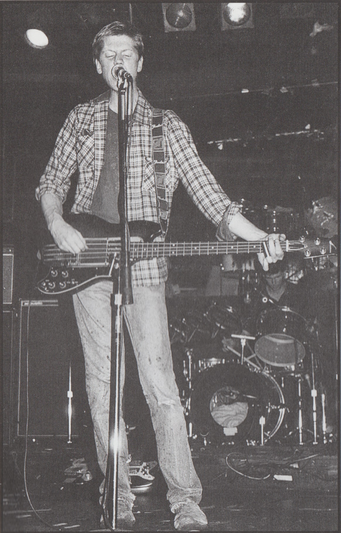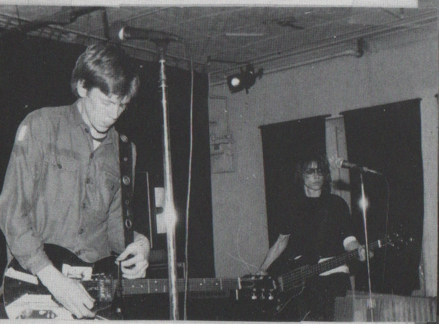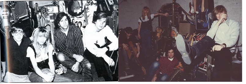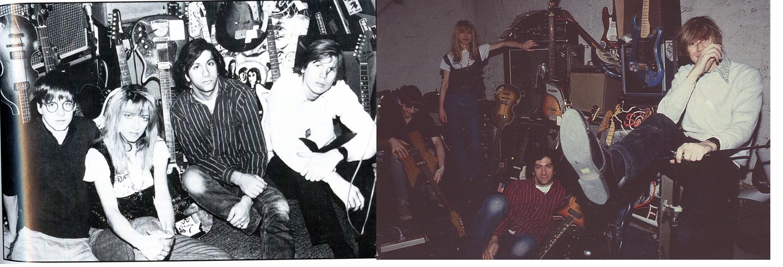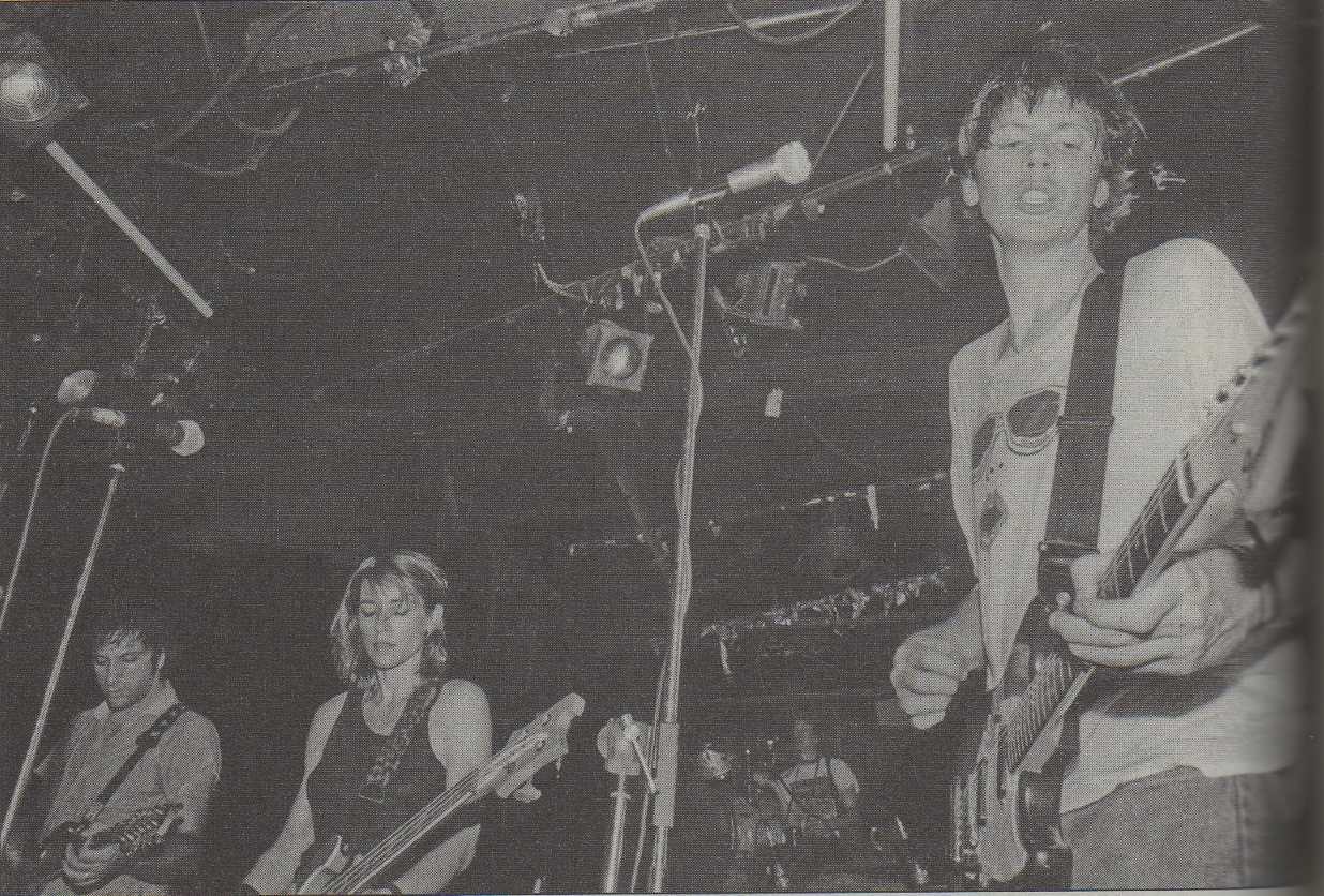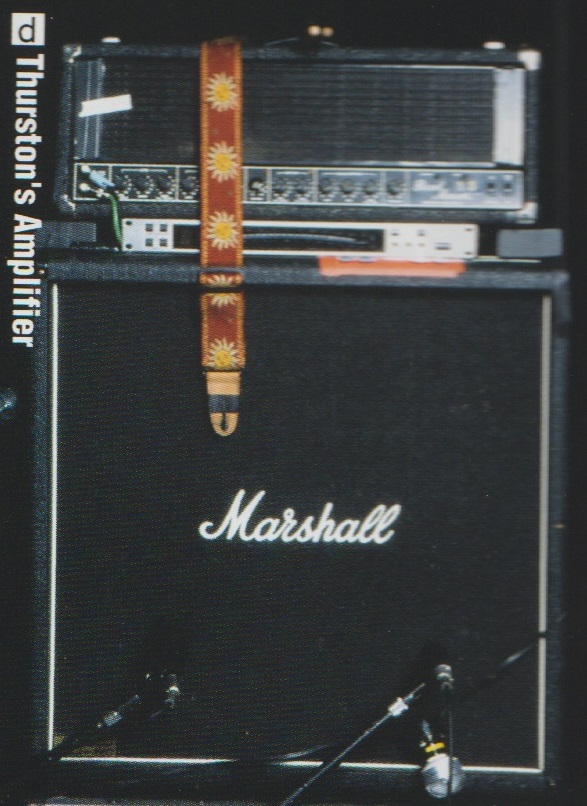 The instruments featured in a picture that spans both inside covers of the I Dreamed Of Noise book may have been borrowed from the Volcano Suns - the bass Thurston is playing is definitely Bob Weston's, and the Fender Lead II could be theirs as well, though I'm not entirely sure what the circumstances would have been (even if Lee needed to borrow a guitar for standard tuning to do a cover like "Be Yr Dog", wouldn't Thurston just use Kim's bass?). If you're a Bob Weston expert and can pinpoint when this might have been taken, please write! Thanks to Neal M. for the tip.
