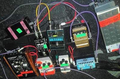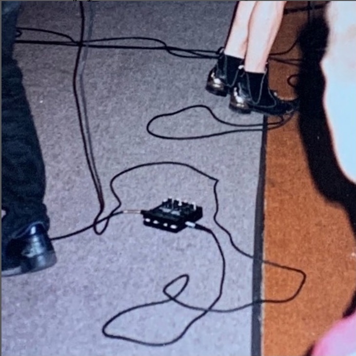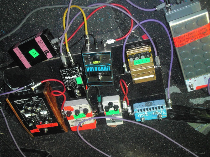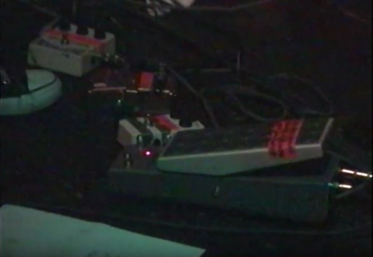 BONUS UPDATE 11/07/20: Thanks to another tip from Gael Remy, I've discovered that I could have saved myself a lot of time by typing "Jim O'Rourke pedals" into Google, since the first result (even before this page!) is a very clear picture of his Nurse-era board in all its beauty, which seems to have been posted at the sy.com forum at some point. So! At least now I'm aware that the blue thing is a Zvex Ooh Wah, and Gael has suggested that the DOD pedal is a taped up or scraped off FX33 Buzz Box, a fuzz/octave based on the Melvins' Buzz Osbourne's tone. I agree with Gael's assessment based on the black/yellow peeking through in this new (to me) picture. Thanks again Gael and whoever took the picture!
