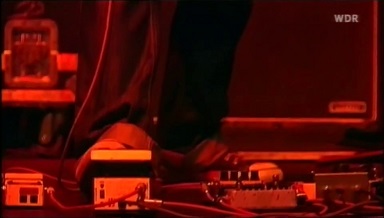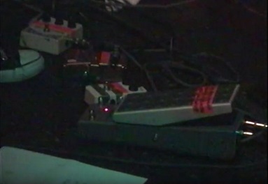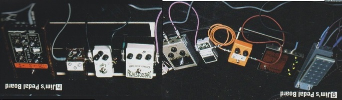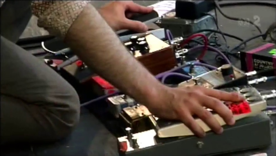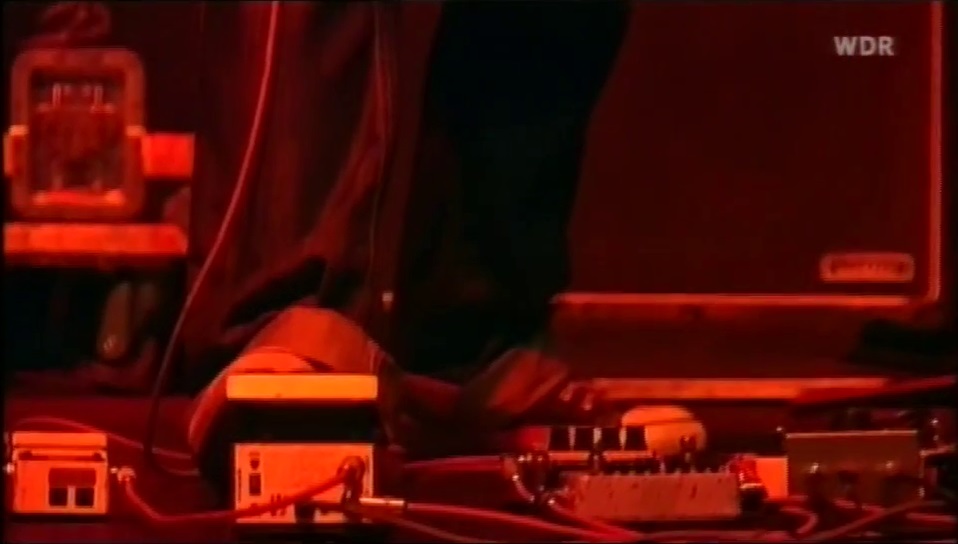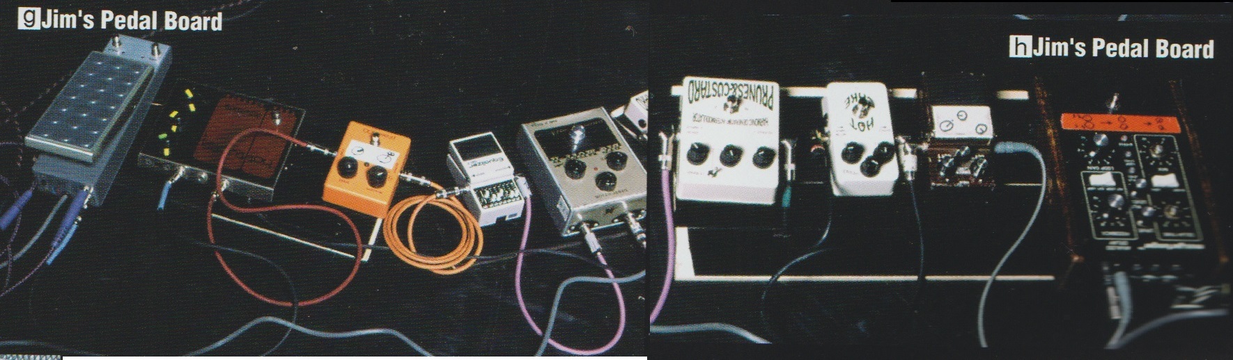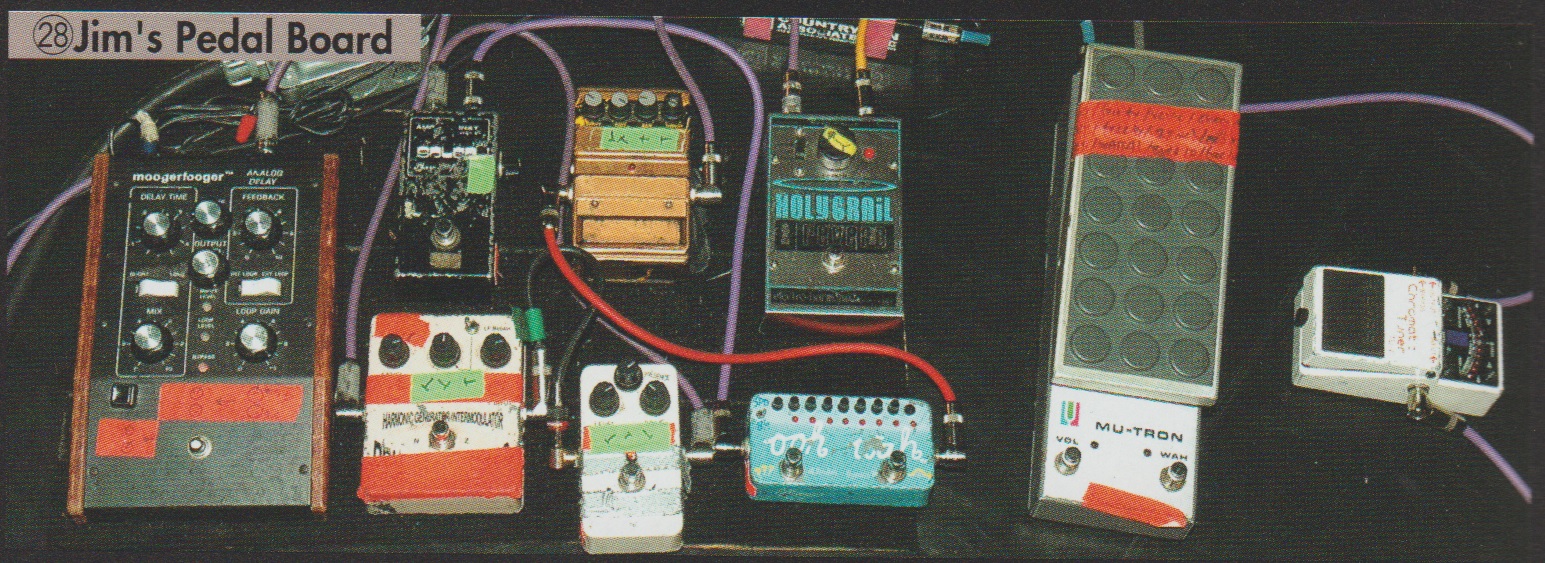 One final stompbox puzzle: What was Jim's board after 2003? I photographed it in August 2002, and a Japanese magazine did the same in February 2003, but after that there isn't much useful information. I pored over all the videos I could find to try to get productive freeze frames, with some level of success after hours of investment. Beginning with the May 2003 PBS performance, we can see he's using the BOSS OC-2 Octave, Mu-Tron Wah/Vol, Boss GE-7 Equalizer, MXR Phase 100, Moogerfooger Analog Delay, Crowther Hot Cake, and Crowther Prunes & Custard. There's another box next to the Prunes & Custard but it could be a power source or A/B, not sure. A December 2003 video offers one nice shot of Jim's pedals, including the first instance I've noticed of a DOD pedal that I can't identify, alongside the two Crowther pedals and the Wah/Vol: