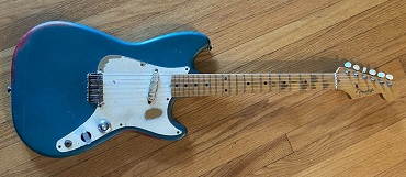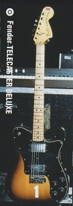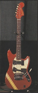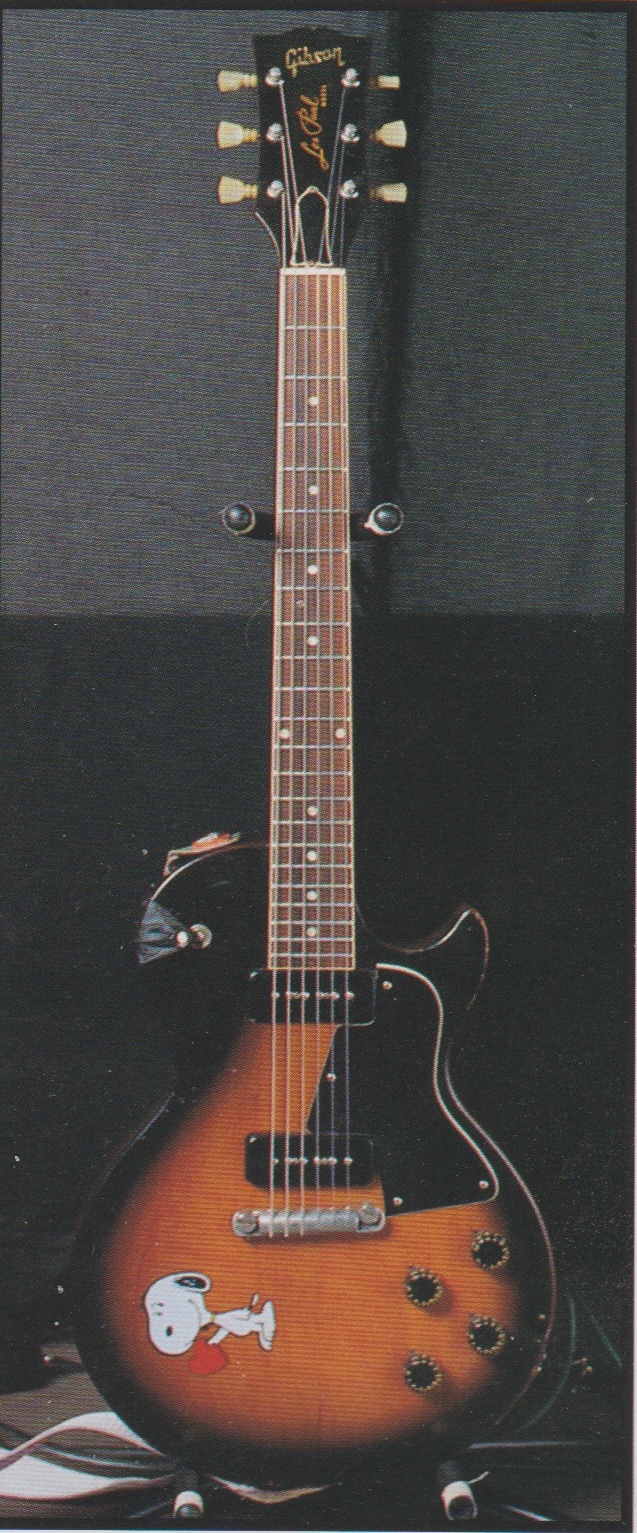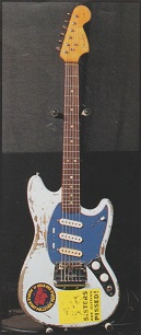What else...? Chris Summerlin wrote to point out something very interesting: Lee's infamous sunburst Mustang currently has the neck from the old black "Goo" Mustang. It's been noted that the black 'stang had been poorly reshaped, and it's not entirely clear if the headstock is from a yellow competition model, or just a competition decal on a regular headstock, which was apparently done with some sunburst models. If the neck was original to the black 'stang, perhaps it was originally a sunburst whose body received some unfortunate work? The sunburst Mustang's original headstock can be seen in the "Sugar Kane" video or this pic of Thurston.