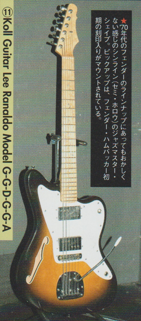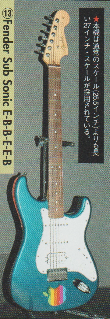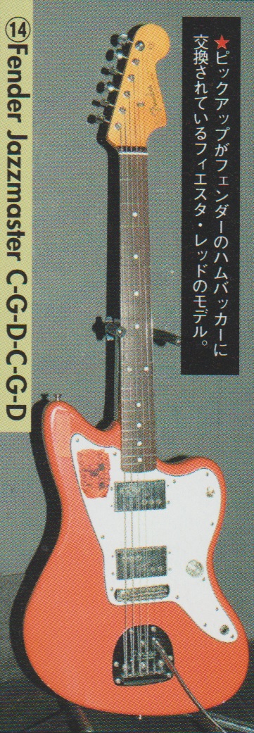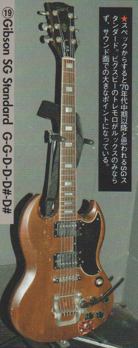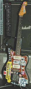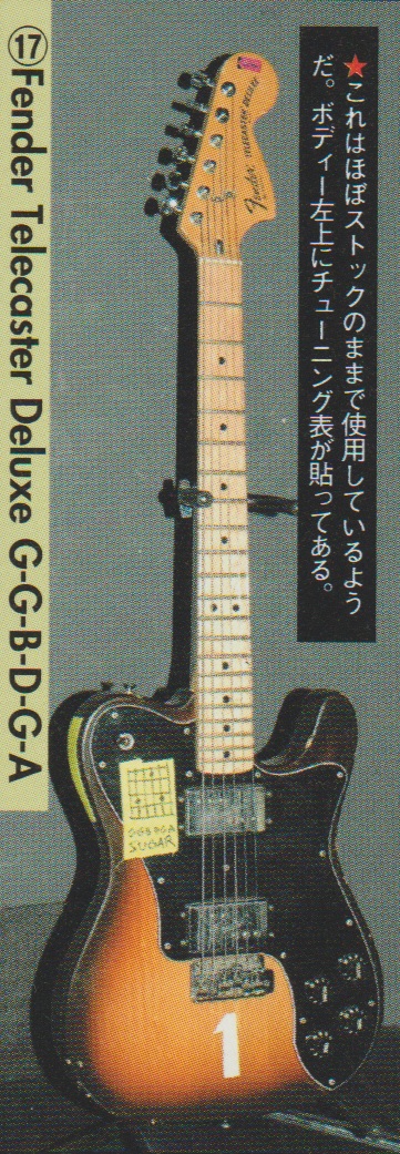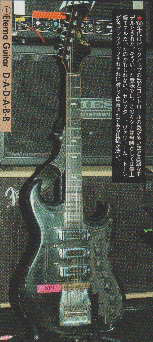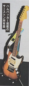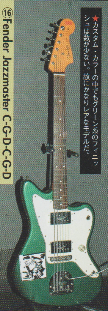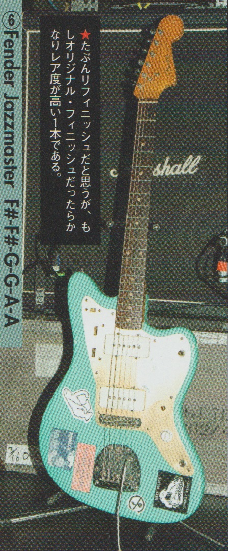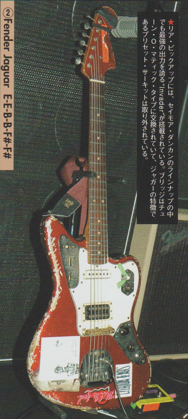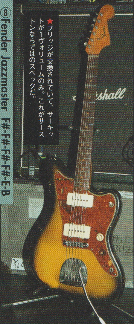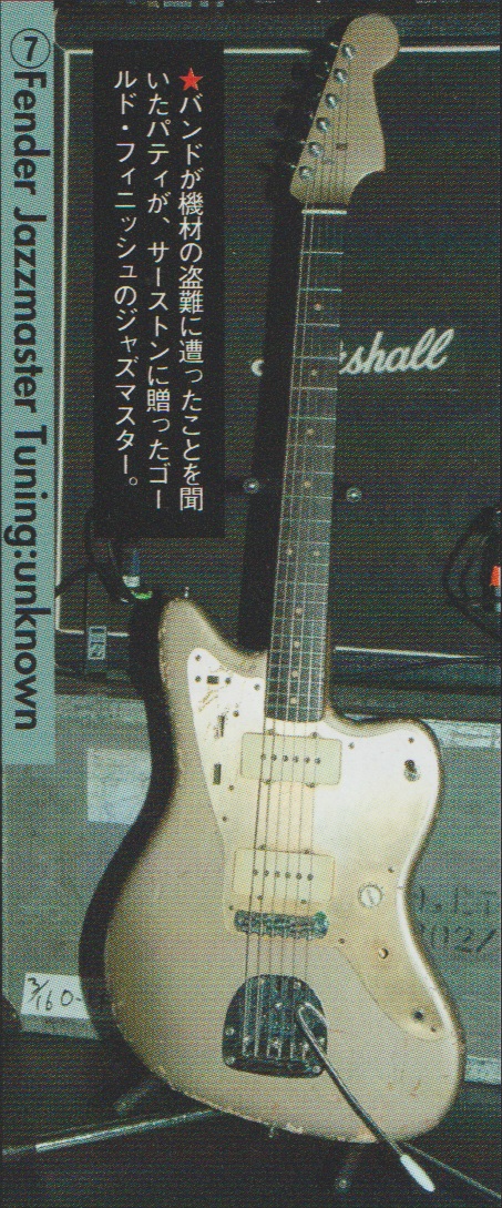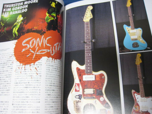 For the 1996 material, I don't know the original source. Around the turn of the century, I purchased three pages cut out of a magazine from eBay, since they depicted 17 (!) clear pictures of Sonic Youth's guitars. I still don't know if they were published in another magazine first, but they appear to be from this compilation mag called The Guitar 8. I'm missing the first page, with the live picture and introductory text, but the text I have begins with Thurston's first guitar, so I don't know if much critical data is lost. At the time, I didn't realize they were taken during the Japanese Washing Machine tour in January 1996, nor could I read the Japanese text, but I knew the pictures were special. Indeed, they remain some of the clearest photographs of some of the band's most popular instruments, including many that were victim to the gear theft. I'm now able to translate the text roughly enough to clarify some of the specs they observed while photographing the guitars. For this feature, only guitars are documented, no amps or effects.