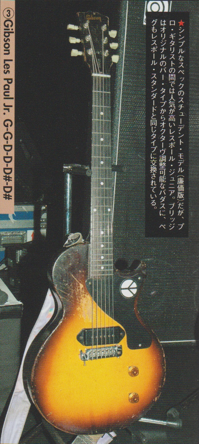 Two years later, in February 2003, it happened again. This time, I'm pretty sure the pictures were originally published in Young Guitar magazine, but I have them in another fantastic compilation called Guitar Breakers. I'd already scanned all of the SY content for the Gear Mags page, but I've added the translated specs on the gear below. They even included a master table of all the tunings used for each song in the set list, and the corresponding guitars! I'd be curious to know if that Young Guitar mag has any extra/different content...