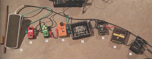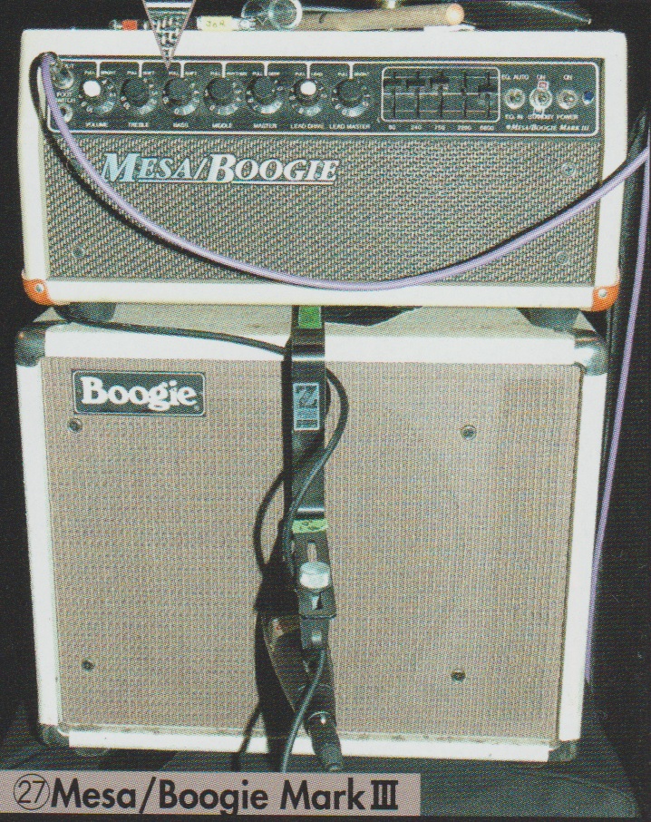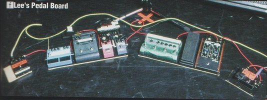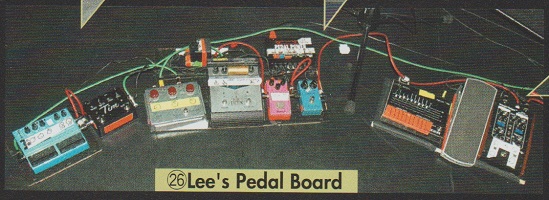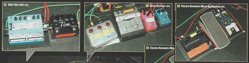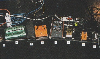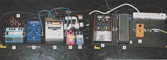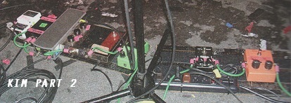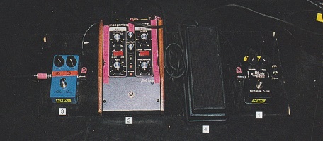 Moving on to 1987 effects, I tried to identify the effects seen in that amazing Pukkelpop '87 footage. Kim is definitely using an Aria MP-5 Metal Pedal and a Crybaby wah in this picture. Lee's are a bit trickier: