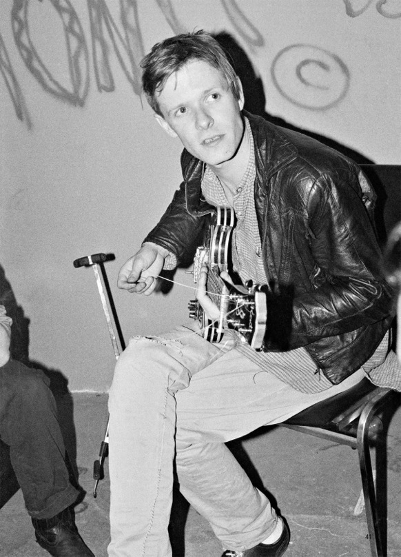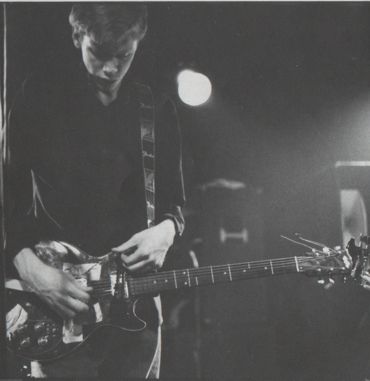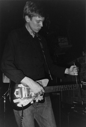 The mythical Drifter appears in two pictures in the Sonic Death CD liners. In both, Thurston is holding a cowbell under the strings with his left hand. They're not dated, but one is definitely from December 27th, 1982 at the Kitchen (the other one must predate this based on the lack of tape over the knobs). Once again, a new drummer is behind the kit - Jim Sclavunos was making his live debut with the band, launching a very short stint that included most of Confusion is Sex, which is no small feat. Thurston recalls using the cowbell/Drifter combo on "She's in a Bad Mood", but my longwinded theory suggests it may have been "The World Looks Red" instead. Aside from the other picture in Sonic Death, which I assume is also late 1982, I only know of its appearance at the November 8th, 1983 Milan show, where it has been relegated to drumstick guitar for "The Burning Spear". (As of these December 1982 photos, the Harmony Bobkat is still Thurston's drumstick guitar of choice.)