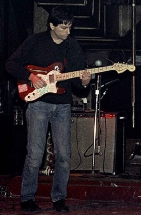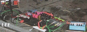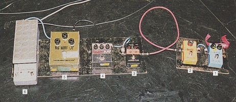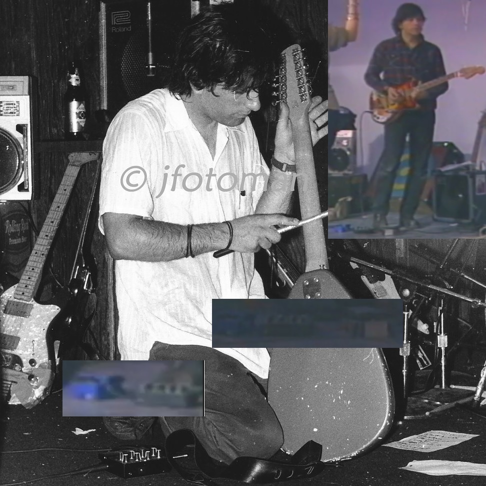 I'm curious if anybody can identify the black effects box seen in these pictures. I wasn't able to find anything with an 8-knob configuration that matched what I thought Lee would be using in '86, so I'd appreciate any help! The main picture was taken July 86 in Columbus and the insets were taken December 5th 1986 for Mike Kelley's "Plato's Cave.." performance, and may be the first time I've seen the BOSS Compression Sustainer and Crybaby(?) wah.