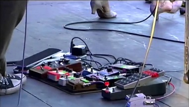 Unfortunately my efforts to get quality screencaps from 2004 were largely unsuccessful - grainy Leno and Kilborn vids offer tiny clues, but most of the best shots are gathered from 2005 pro-shot festival sets. I already mined these for the "Effects" page, but I took a second pass and really tried to find clear snaps of Jim's ever-shifting board (seriously, it's slightly different at each performance I watched from June/July 2005). Here are a few, which helped illuminate things: he was still using the Wah/Vol, the two Crowther pedals, and the Moogerfooger Analog Delay (the expression pedal seems to come and go, though). The mystery DOD pedal is still there - I know it should be easy to identify by color but I'm not sure! I do spot an Electro Harmonix Holy Grail Reverb, two of which were sold in the Reverb auction. There's also a BOSS chromatic tuner on the outskirts, and the equalizer is gone. There's also something that seems to have two footswitches, and something with a single footswitch (on either side of the Holy Grail). I'm embarassed to say how long I spent trying to get even better pictures to shed just a little more light on these mystery effects...
