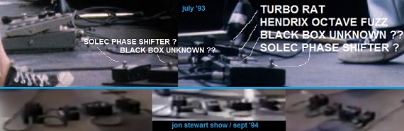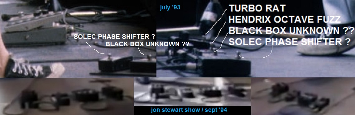 Kim's effects are somewhat unclear to me once she starts filling her board out circa '93. Prior to this, she basically had a Turbo Rat and a Crybaby, with the Hendrix Octave Fuzz added circa Dirty. In these pix from the July '93 tour she has four pedals - the Turbo Rat and Hendrix Fuzz remain, but the Crybaby is gone, and two unknown pedals have appeared. I'm wondering if they are two of the mysterious pedals auctioned in 2018, the Solec Phase Shifter and the "Black Box" unknown fuzz pedal. While it did turn out that Jim had used the Solec pedal for a while, Kim may have tried it earlier. I haven't been able to find another pedal with that same slope, and it seems to have similar lettering, and the knob on the side...I could be wrong, though! In '96 she has an MXR Phaser in this slot, so that may have been a replacement for the Solec...? Likewise, the black box pedal could be anything, but I ran through a lot of options before noticing some things that lined up. The pedal did have settings drawn on it when it was sold, which usually indicates it had been used live at some point. It's another fuzz pedal, which Kim seemed to enjoy using. Can you tell what her pedals are from these few pics? If it helps, I have included some caps from their appearance on the Jon Stewart show in September '94, where she seems to have the same line-up.