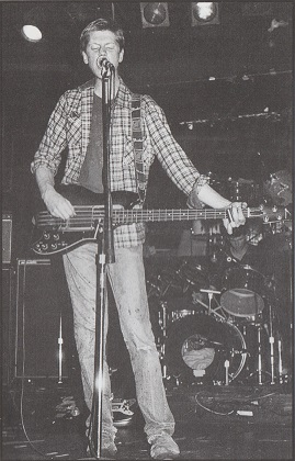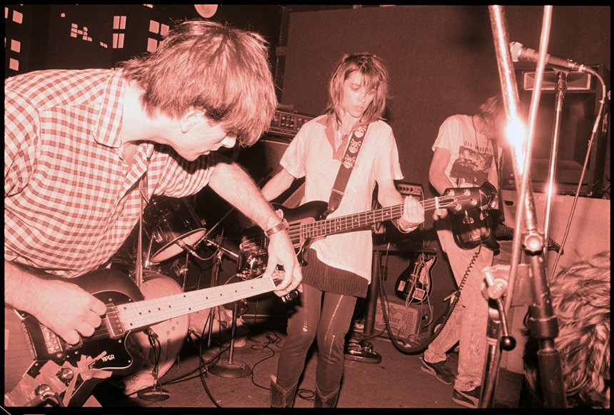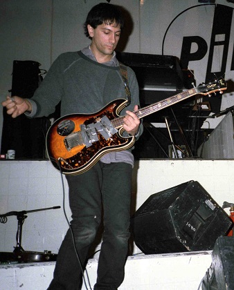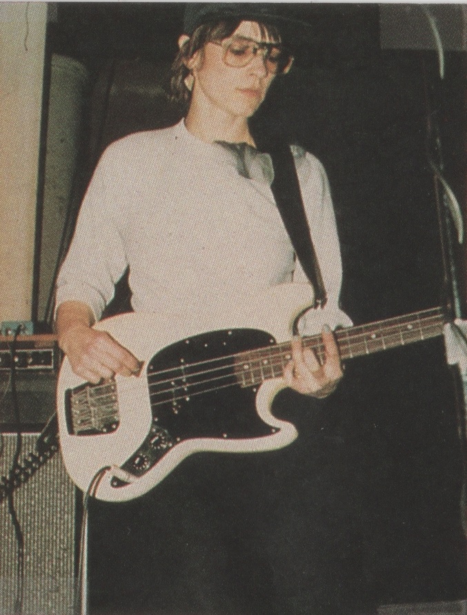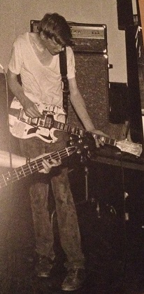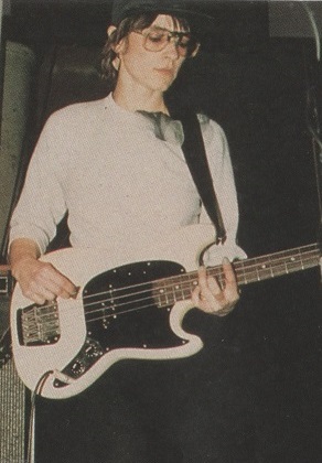Otherwise, the earliest known pictures of the band's instruments are from the December 13th, 1981 CBGB set. At least four great pictures exist, including some that capture Lee with the drill back when he still used it for "The Burning Spear" (I'm not exactly sure when he stopped that particular trick). Thurston is playing his Harmony Bobkat, Lee is playing his f-hole Telecaster (purchased in Endicott when he was with the Flucts), and Kim is playing a black Les Paul-style bass. This carries forward until at least February 1982, after which Kim is seen with a white Fender Mustang bass. The Mustang bass appears in photos up until June 1982 (maybe it was Richard Edson's, who finally exited this month). It's worth noting that they may have shared basses with Swans early on - live pix (with guest bassist Thurston) indicate they used both the black Les Paul and the white Mustang basses.
