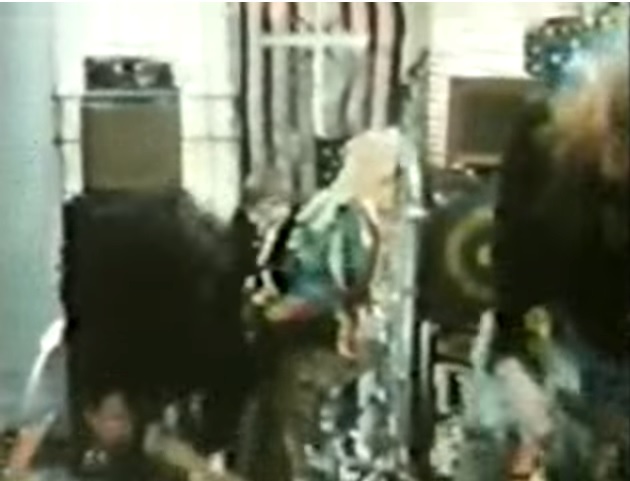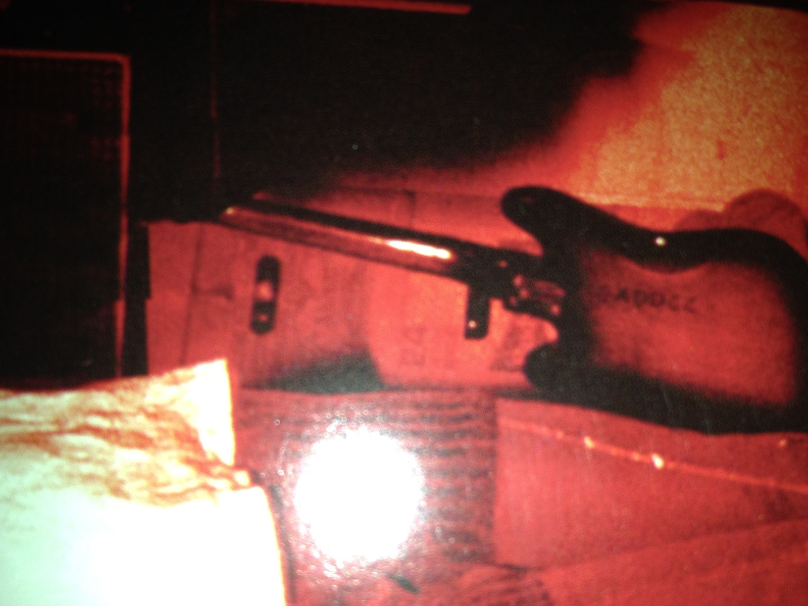 I'm haunted by another guitar from the '85 era. I'd previously added the Hagstrom Viking based on this picture of Lee and a bunch of guitars, from the spring '85 European tour. I couldn't imagine what it was used for - "Halloween"? - "Satan is Boring"? - and then I stumbled across a picture of Lee actually playing the damn thing! Undated - but Kim is singing. Hmm. And wait...there's a screwdriver at the 9th fret? So, Kim is singing...there's a screwdriver..."Flower"? Possibly this was a spare GDD#, a back-up for the Kent? Could it be anything else?
