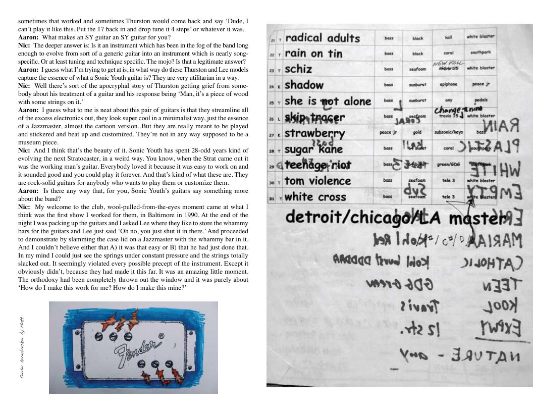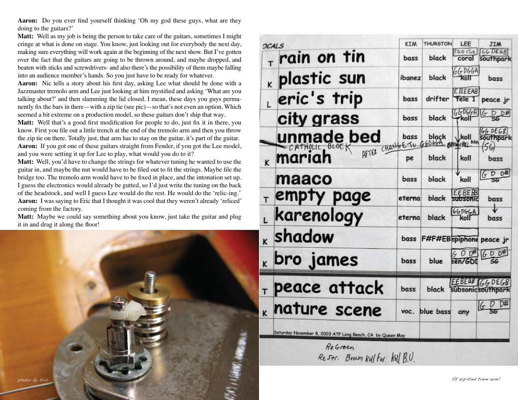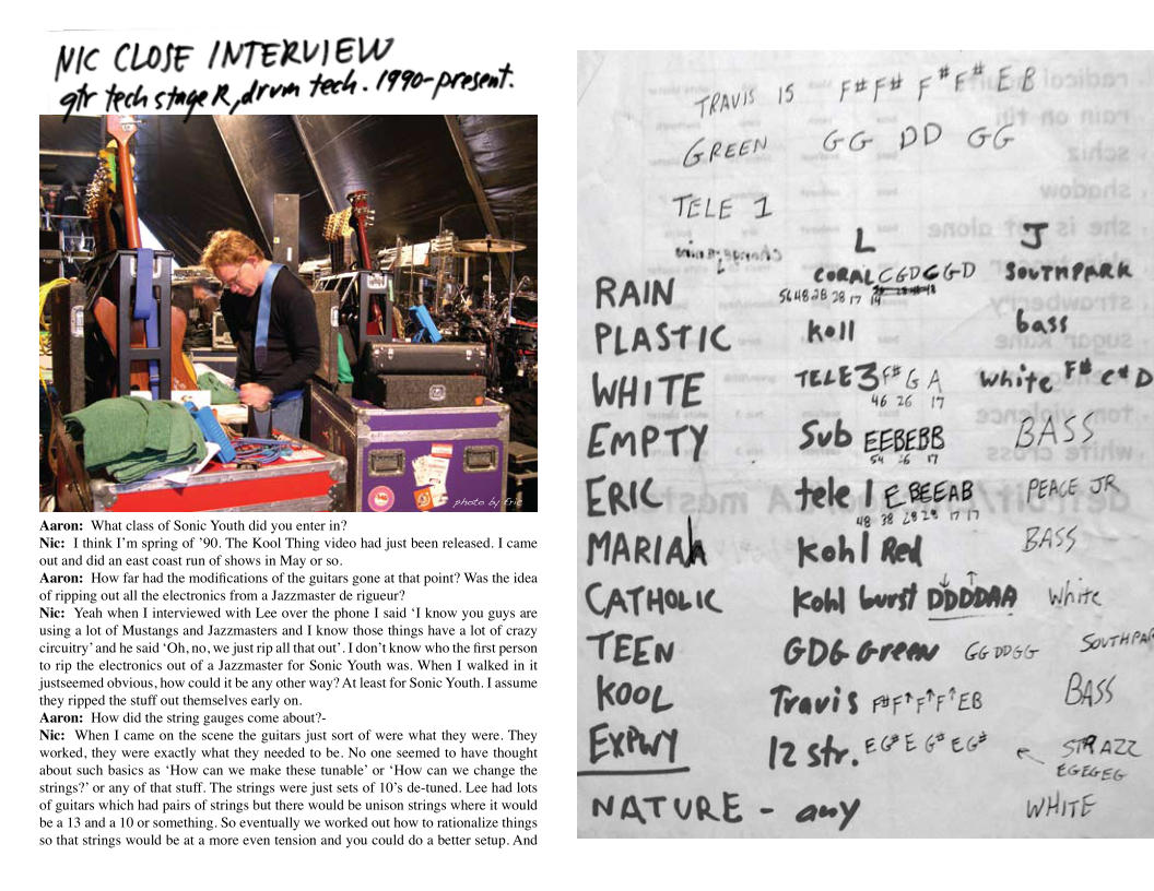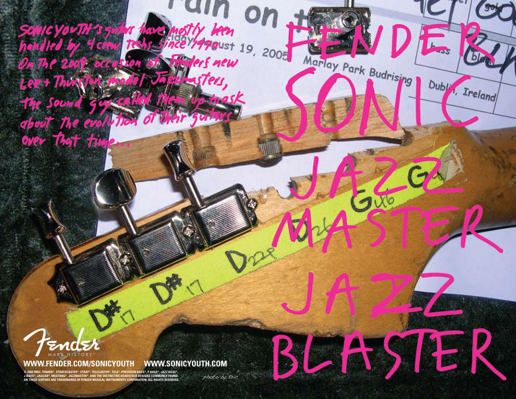 When Fender released signature model Jazzmasters for Lee and Thurston in 2009, they came with a mini zine packed with fascinating info courtesy of SY's techs. Aaron Mullan, the band's soundman/engineer, interviewed the key 4 guitar/drum technicians that the band have worked with: Nic Close (1990-2009), Jim Vincent (1992-1998, 2007), Eric Baecht (1998-2011), and Matt Zivich (2009-2011). I've met all these guys over the years and they've always been extraordinarily kind and helpful, and total pros at what they do. As you can imagine, being a tech for Sonic Youth can be a complicated task! Many cool gear/tuning notes are replicated, and each tech discusses a different aspect of the band's approach towards gear along with details on how to modify your newly purchased Jazzmaster/blaster to make it SONIC.