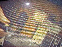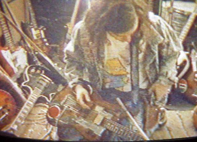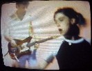 One of the most distinct, recognizable guitars in Sonic Youth history. This very bare wood Jaguar had numerous different pick-up configurations throughout its use by Lee, and its body was throughly scratched and layered with duct tape. HOWEVER! As I'd suspected for a while, this guitar was cleaned up in the late '90s, w/ a tortoise shell pickguard added and the pickups replaced with Tele Deluxe pickups (which would make this a Jagblaster?!). It was seen like this in 1998 and 1999 (the bottom 4 pictures). I'd previously thought this cleaned up version was the same guitar used here, a wood Jaguar used by Thurston in the mid-80s, but a new photograph clearly depicting the stickers on this old Jaguar, which match with the '98 pictures, confirm that it is actually this guitar. If that makes any sense! It was stolen in July 1999.