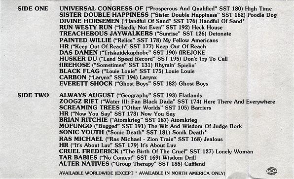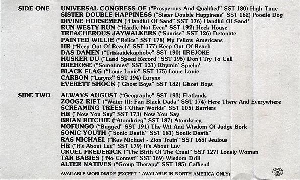 SST promotional cassette sampler for in-store play. SST issued a few of these, and this one contains something I find particularly interesting.. a track entitled "Sonik Death", listed as being from "Sonic Death". Turns out it's an excerpt from side 2, specifically the 'Early American' portion, from roughly 3'25" til 7'45". Presumably this was to support the SST reissue of 'Sonic Death' on CD.