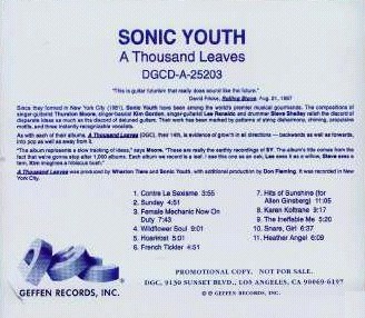 On March 19th, 1998 the songs were debuted with vocals in Austin, TX. In mid-late April, SY played 4 northeast college/university gigs, playing everything from the album except for "Snare, Girl" which was always represented live by its instrumental counterpart "Stil", and "Contre Le Sexisme", which was never reproduced live. "Anagrama" remained in the set. Geffen did not handle the double-vinyl release, instead Smells Like.../My So-Called Records issued it in advance, sending orders in out in late April. When the CD was released on May 12th, Sonic Youth were 6 dates into their North American "A Thousand Leaves" tour -- the first tour since 1988's "Daydream Nation" tour to exclusively feature new material, aside from early favorite "Death Valley '69", performed as an encore at every show. Otherwise, the set lists remained static throughout the tour, switching the order around slightly but never straying from the 9 album tracks, "Anagrama" "Stil" & "Death Valley". On May 22nd, in Seattle, WA, the band added one more "oldie" to the set, unearthing "Shadow of a Doubt" for the first time since 1986. From this point on, the main set would close with "Heather Angel", and the encore was "Stil" "Shadow of a Doubt" and "Death Valley '69", followed by a short noisy improvisation. The shows were truly incredible -- fans hoping for "Teenage Riot" or "Dirty Boots" were disappointed, but those who came open-minded got to hear "A Thousand Leaves" the way it deserved to be heard, live and loud. Frankly, I think the tour exceeded the album in performance quality -- while the album itself sounded like instrumentals w/ vocals layered overtop, the tour versions of these same songs sounded perfectly natural, cohesive, and alive: the ultimate display of sonic energy.